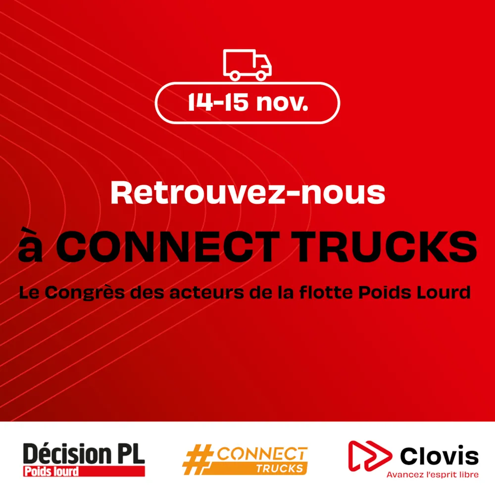 Pour la première fois, CLOVIS sera présent au congrès Connect Trucks, l'événement référence pour les professionnels du transport et de la gestion de flotte poids lourd. Cet événement est l'occasion parfaite pour découvrir les solutions sur-mesure que nous proposons pour accompagner les professionnels dans la gestion et l'optimisation de leur parc de véhicules.